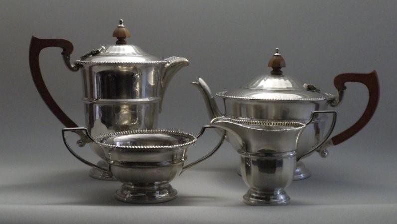 すっきりとしたデザインのティーセット。持ち手は当時のベークライト。