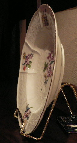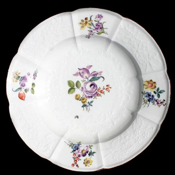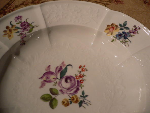 ドイツ 1750年 マイセンでも比較的初期のものです。ゴツコブスキーと 呼ばれるレリーフの皿に、ブーケが描かれています。 絵付けもかなり上手のものです。 サイズ:直径24p