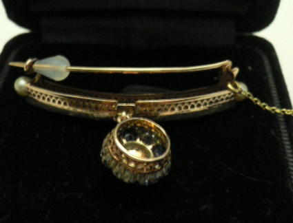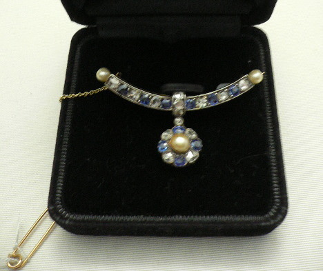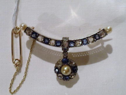 ダイヤとサファイヤがふんだんに使われたバーブローチです。