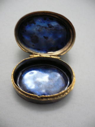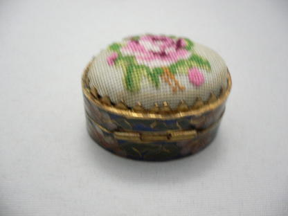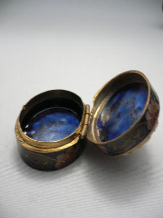 表面全体に青のエナメルが施され、表側ぐるりには花々が描かれています。