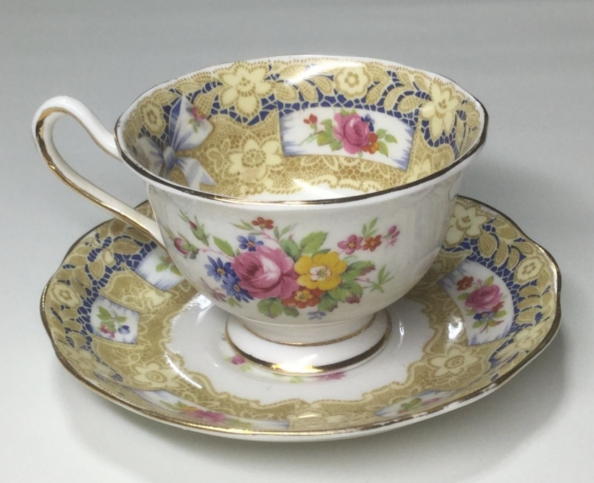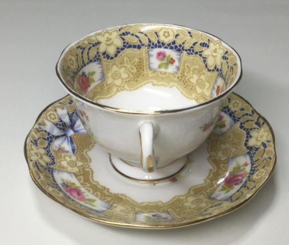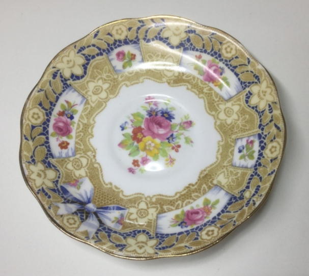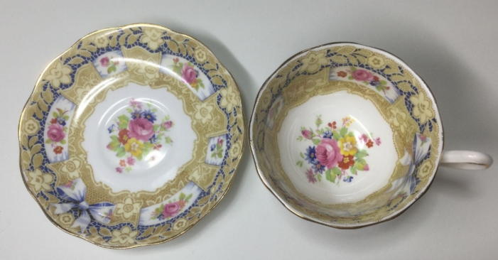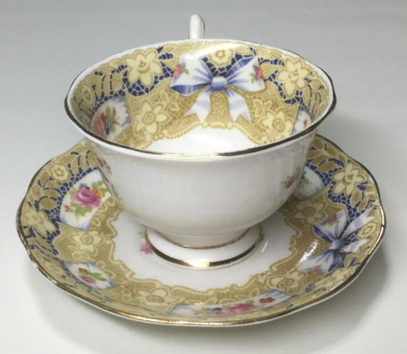 レアなこのカップは薔薇、リボン、レースなどの組み合わせを
