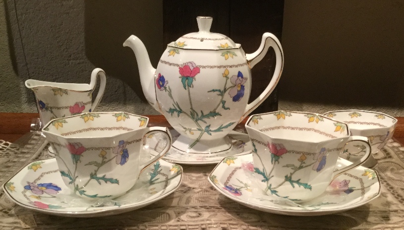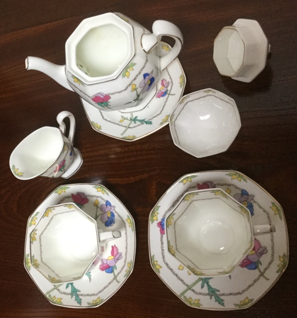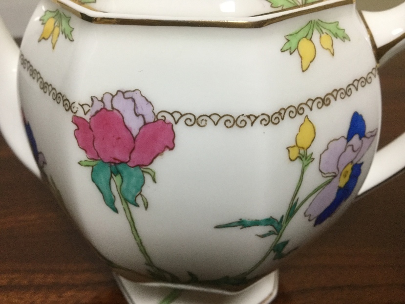 白磁に色合いが美しい花の絵がプリントに手彩色された2人用のカフェセットです。