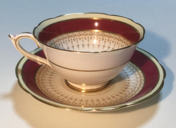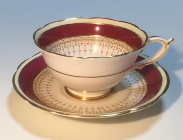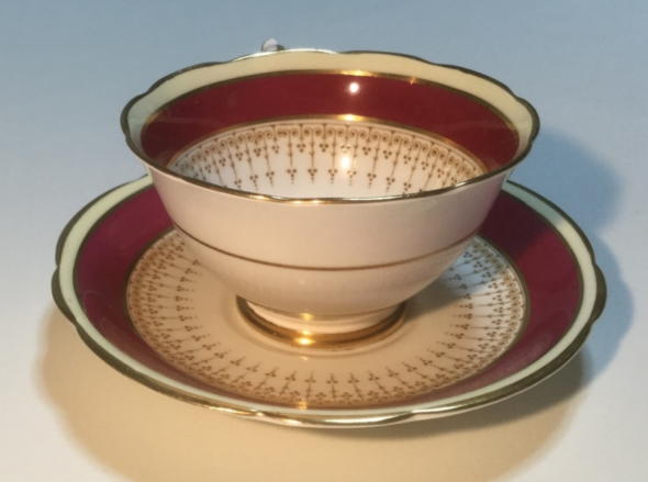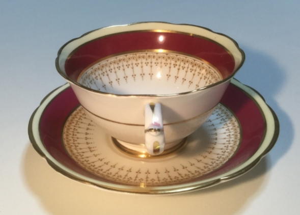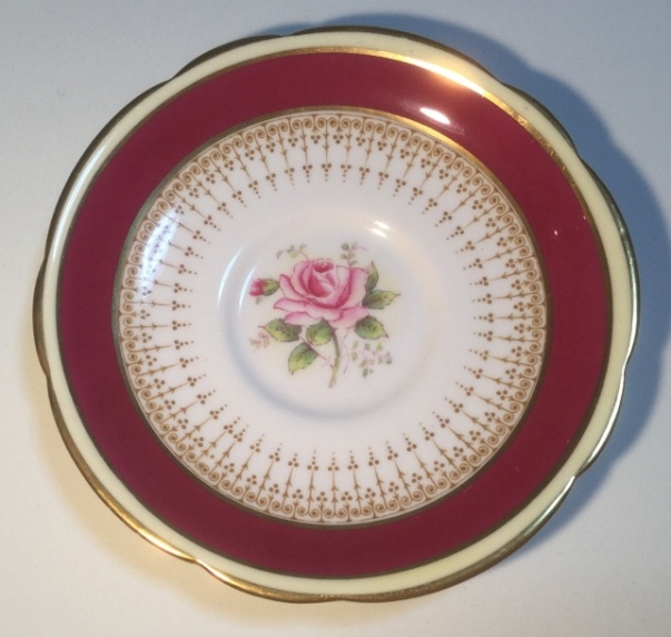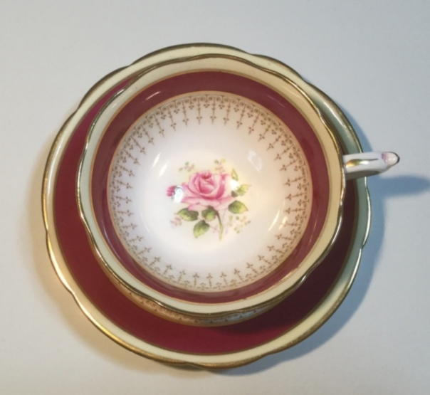 えんじ縁に一輪の手描きピンクローズカップ&ソーサー