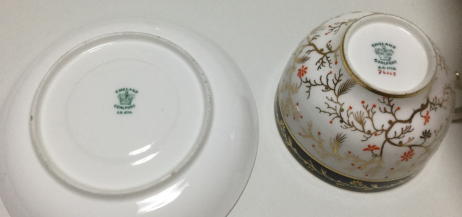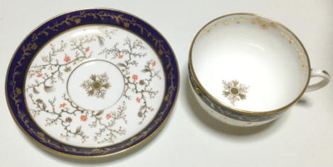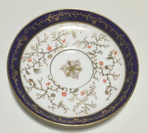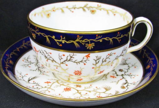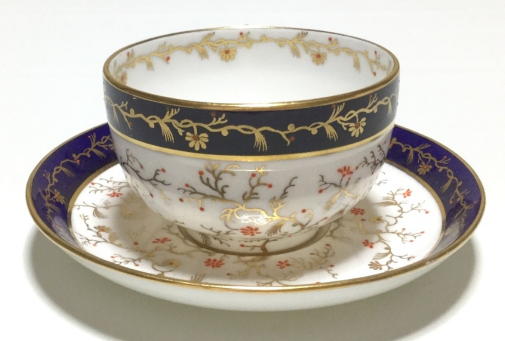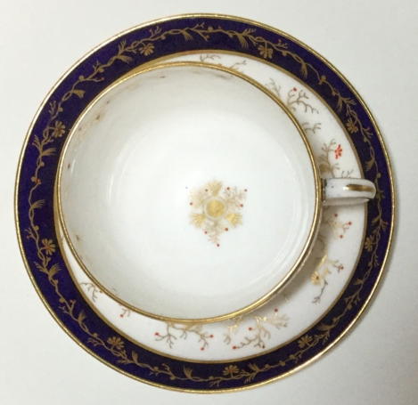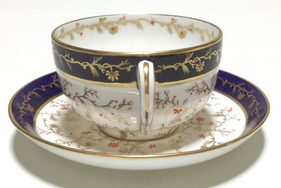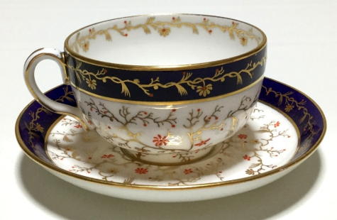カップは白くコバルトブルーのバンドと金の金箔の枝に