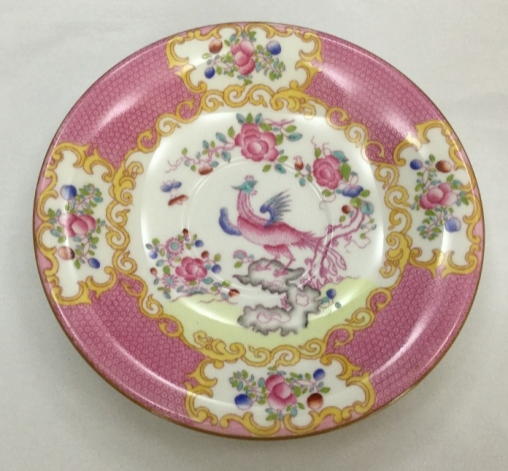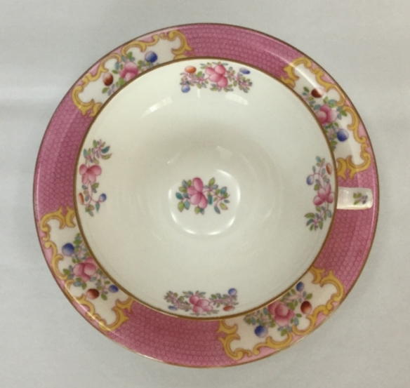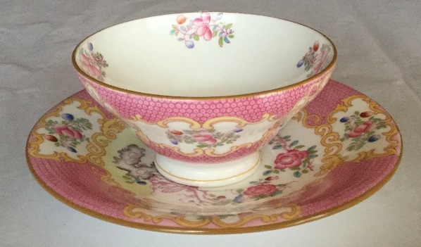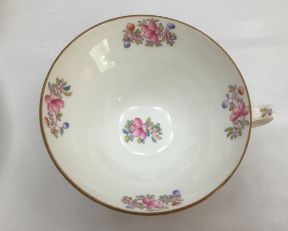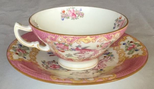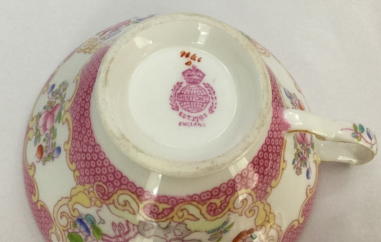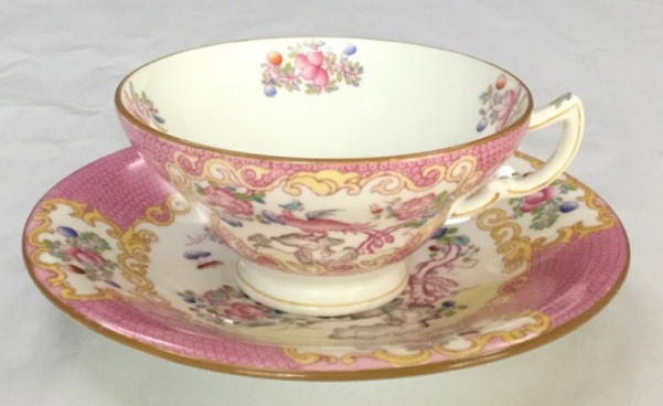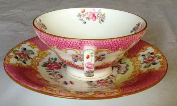 このカップの形は珍しく、全体がピンクの手描きシノワズリです。