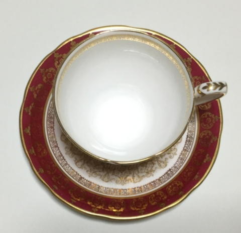 カップは複雑な金のデザインで覆われた豊かな赤い帯で包囲され