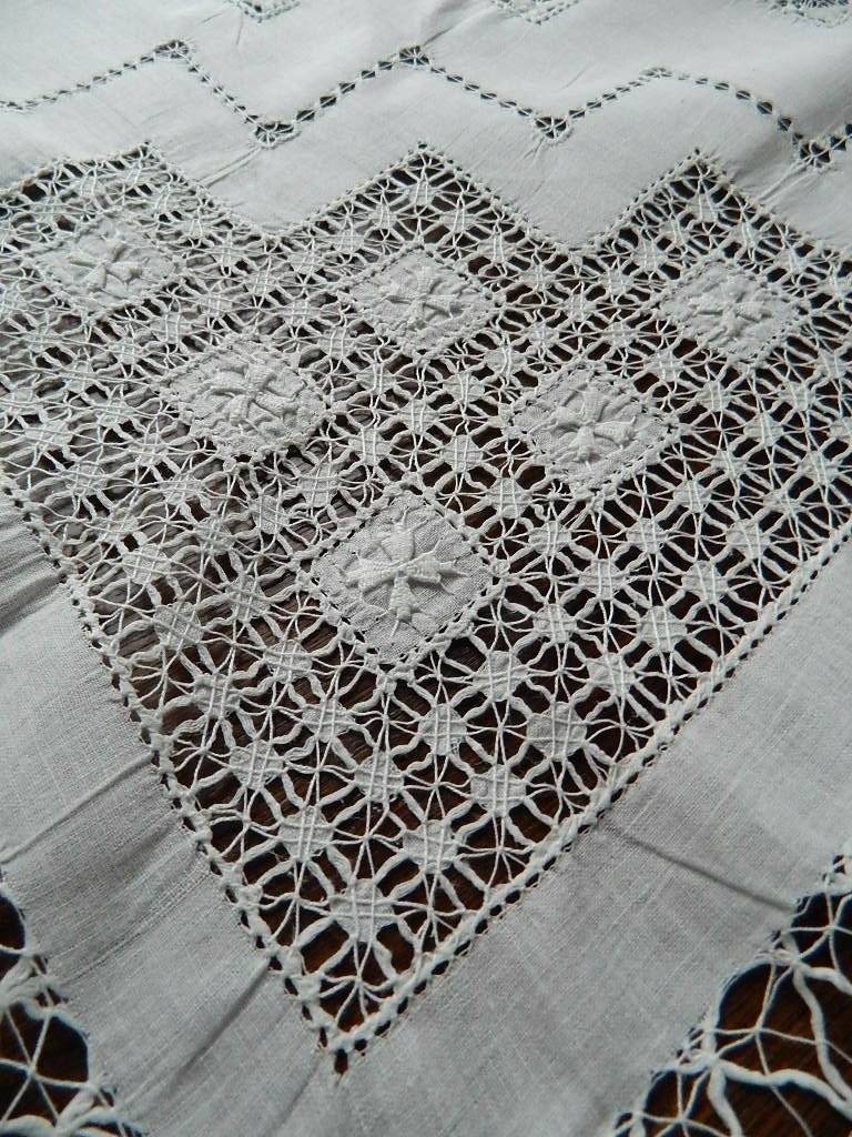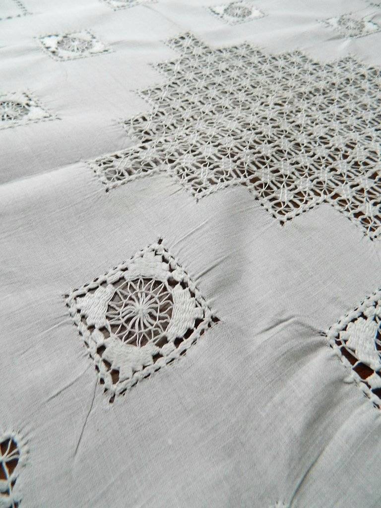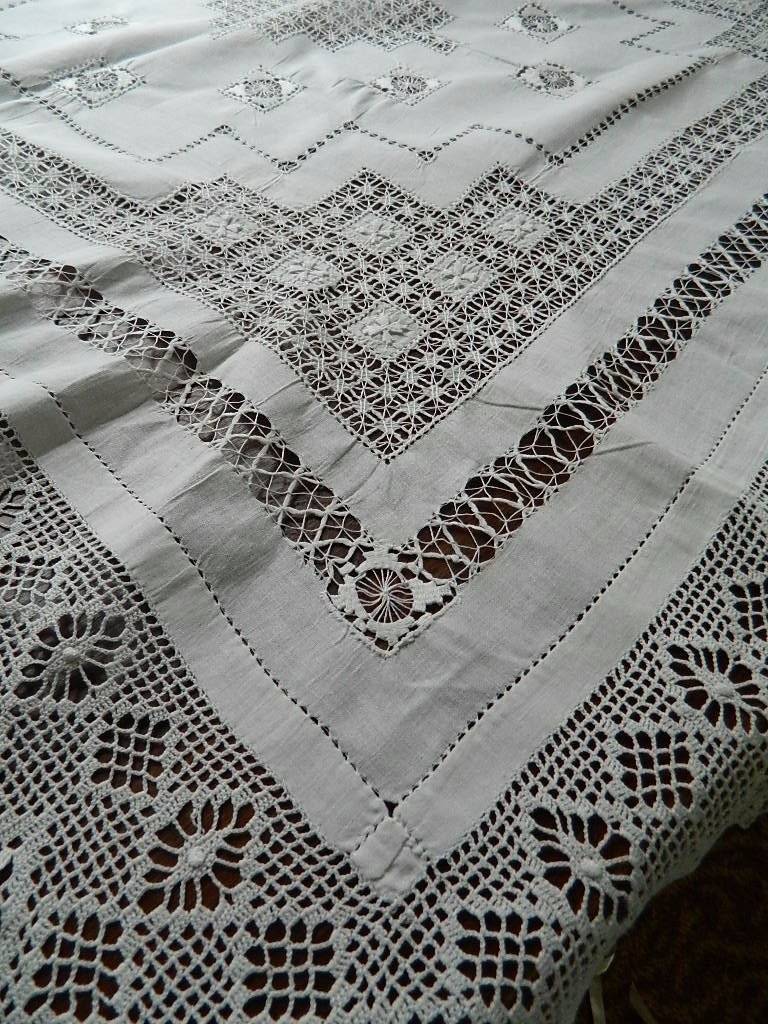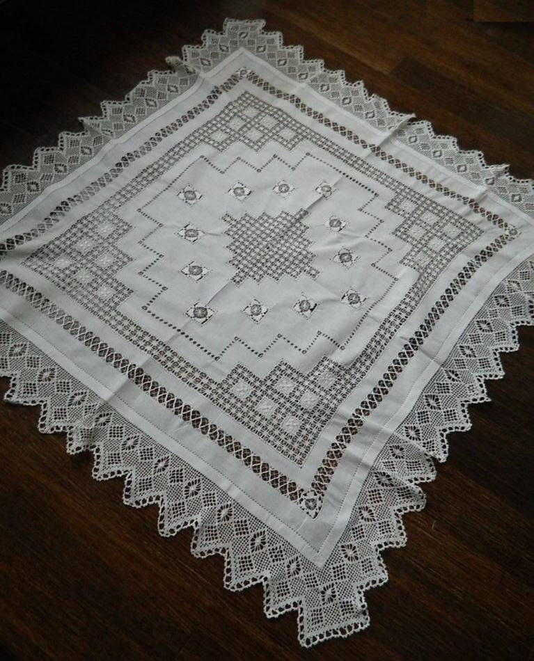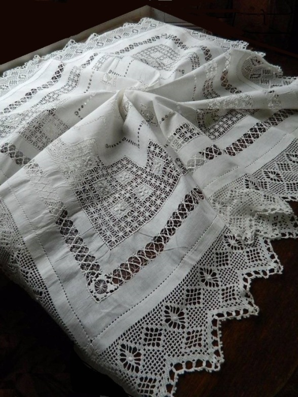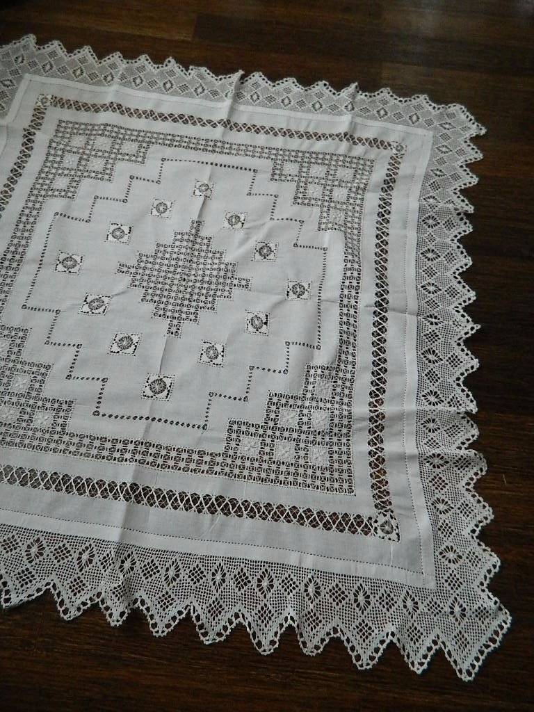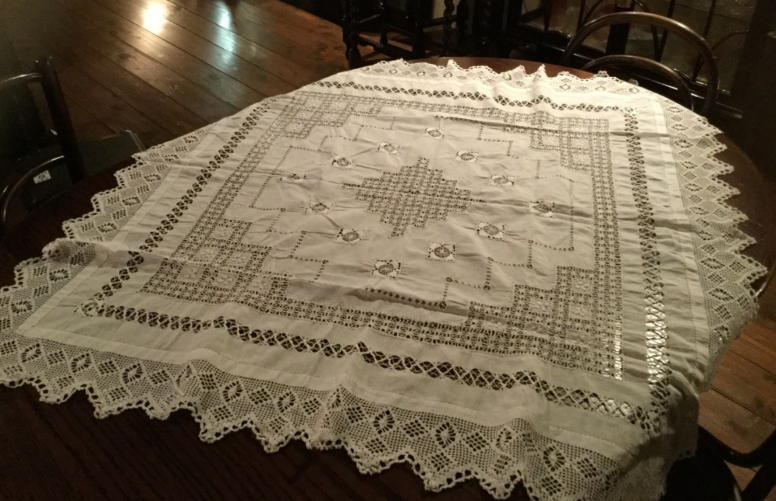 とても手がかかっているテーブルクロスです。縁にはかぎ編みされたレースがぐるり。