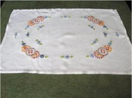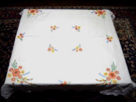 レース縁オレンジの花 リネンテーブルクロス イギリス ビンテージ・刺繍・リネン サイズ:104cm×104cm SOLD