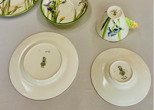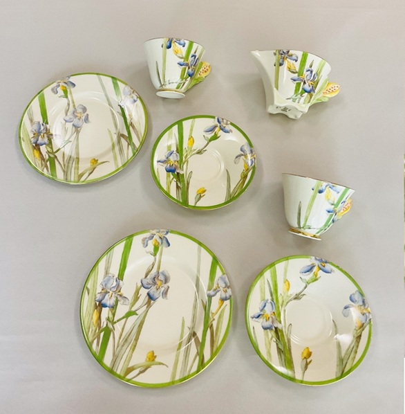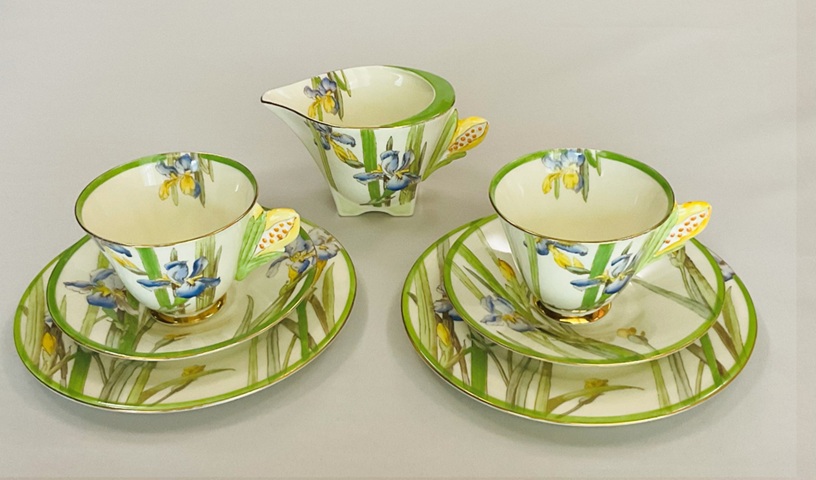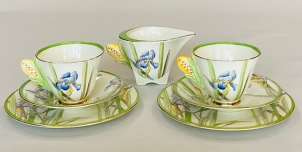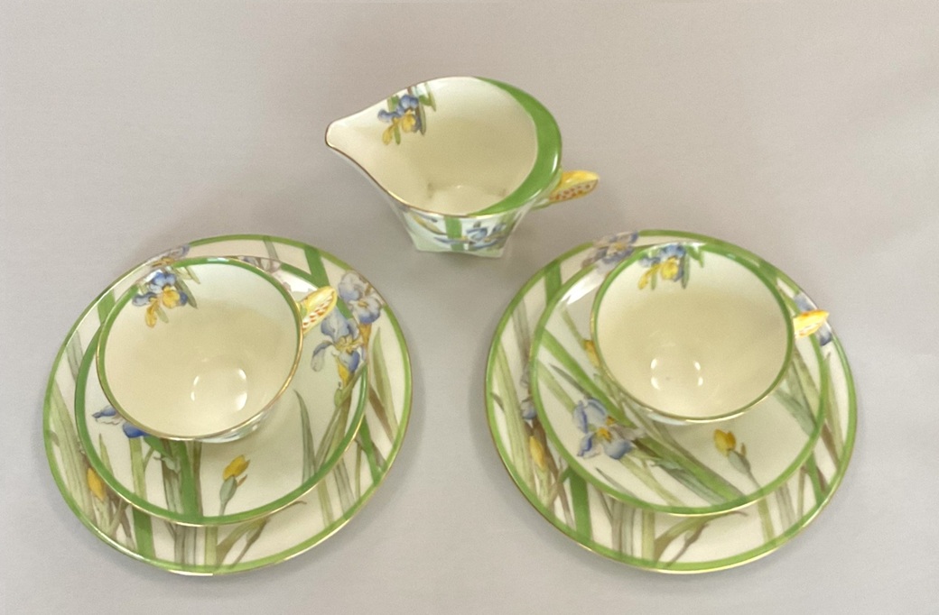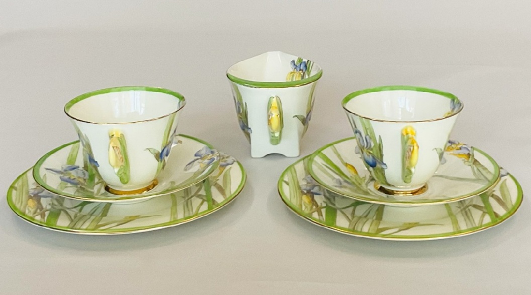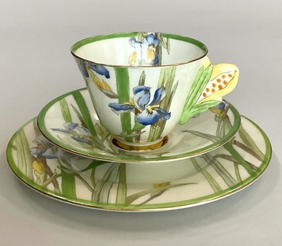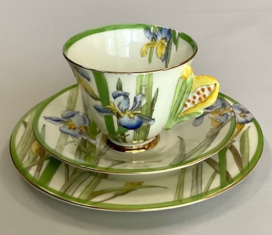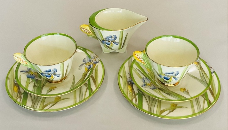 取手がつぼみの菖蒲のカップトリオとミルクジャグのセットです。